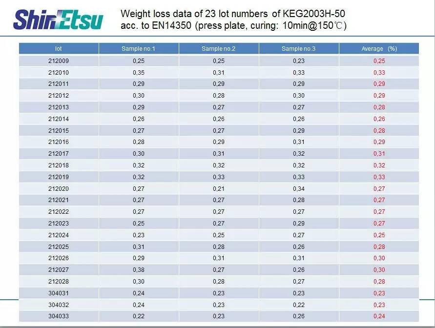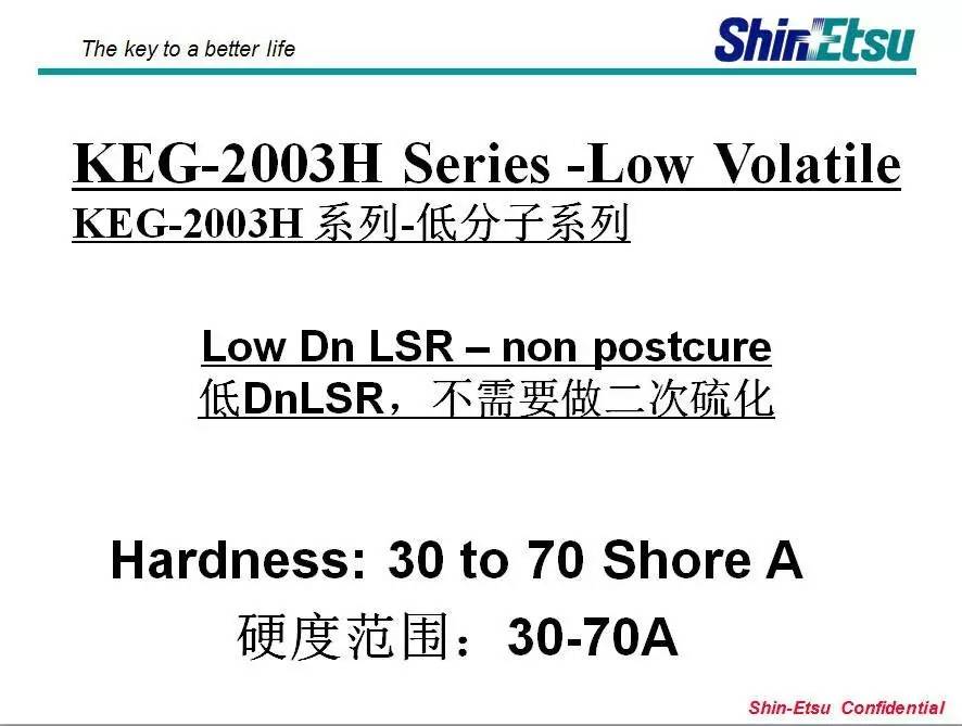 信越生产的一款快快还固化的材料KEG-2003H-30A/B,KEG-2003H-40A/BKEG-2003H-40A/BKEG-2003H-60A/BKEG-2003H-70A/B,其KEG-2003H系列,可以在不进行二次硫化情况下,达到欧洲婴童用品EN14350 VOC要求,大大节省效率和成本,此部分为信越独有的产品。