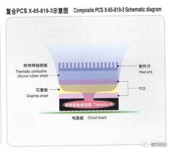 复合PCS X-65-819-3可用于散热用途,其具有4层结构:2层相转变(PCS)层,1层石墨层,1层热传导硅胶片层。中央处理器(CPU)或其它电子元件所产生的热量可使此类薄片由固态转变为液态,从而降低了热阻并具有的优越的散热性勇。