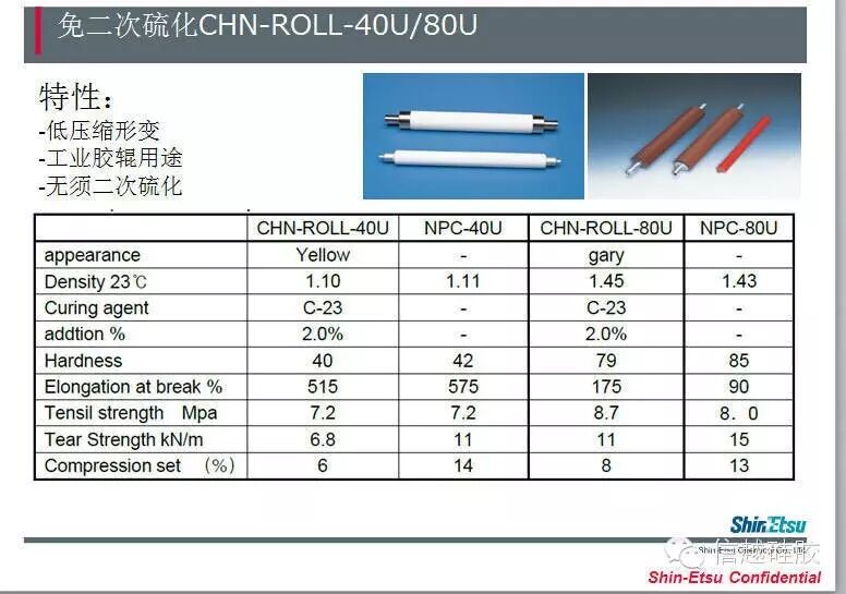 CHN-ROLL-40U; CHN-ROLL-80U 是信越南通工厂专业生产的胶辊专用硅胶,无需二次加硫,低压缩变形,高回弹,耐DOP油,耐温260度,是加工性卓越,适用于各类胶辊、大型按键、杂件、异形件、大型片材、管材及各类要求高回弹好的产品。